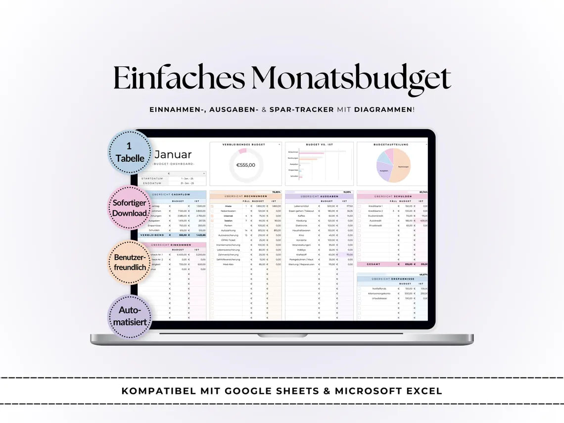 Ein Budgetplan bringt Struktur in deine Finanzen. Statt Zahlenchaos hast du klare Kategorien, monatliche Vergleiche und einen Überblick über Einnahmen und Ausgaben. So weißt du jederzeit, wie es um dein Geld steht – ohne Stress, ohne Überraschungen. -